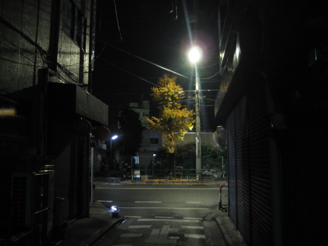 午前5時21分 12月4日、金曜日、J村。 前日に降った冷たい雨もようやく上がり、 黒く晴れた空には大きな月。 「もう冬なんだ」 と思わせる空気、 濡れた路面の上を駅に向かって歩く。 路地からバス通りに出る直前、 前方から明るい街灯の光。 灯のたもとに、イチョウの樹。 晴天、曇天、暗闇。 この季節のイチョウの葉は、どれにもよく合うようで。 PR