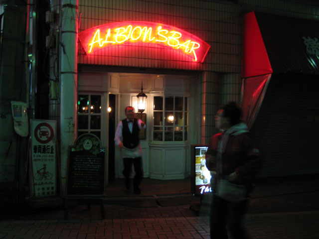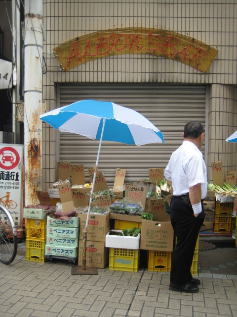 明るいJ村のカウンターバー「アルビオン」。 夜は村で一番クールな佇まい。 昼は隣の八百屋さんが店の前までホットに浸食。