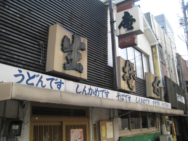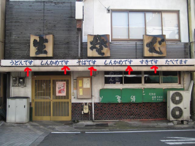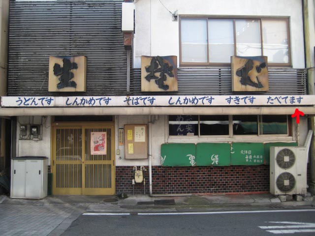 名コピーを軒先に掲げた蕎麦屋、