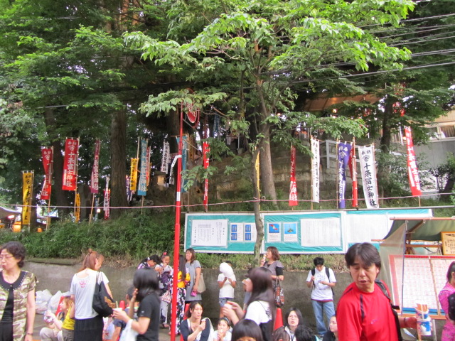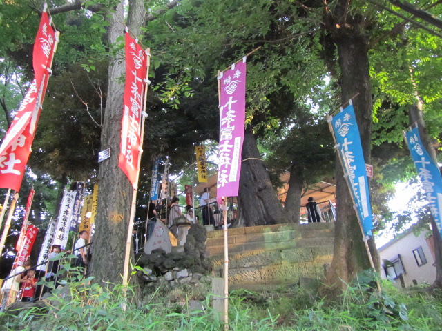 神社の冨士塚には色とりどりの幟がはためく。